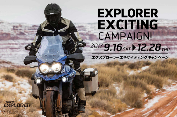 トライアンフモーターサイクルズジャパンでは、全国のトライアンフ正規販売店にて9月16日より『エクスプローラー エキサイティング キャンペーン』を実施することをご案内いたします。