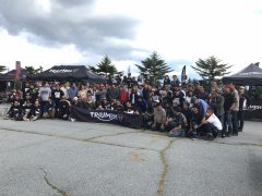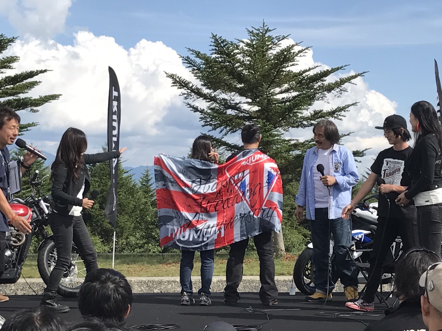 そして、ピンストライプアートが施されたトライアンフフラッグに風間深志さんら出演者全員のサインを添えてプレゼント。