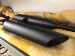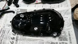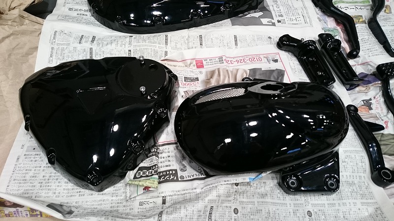 エンジンカバー類やペダル類。今回はあえて艶有りブラックで仕上げています。