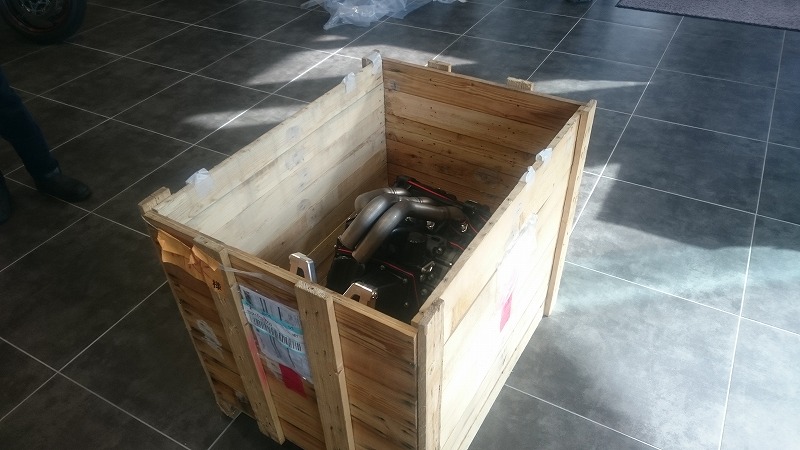 何かというと、初めに「以前のブログ」でご紹介したMoto2用のエンジンが到着!