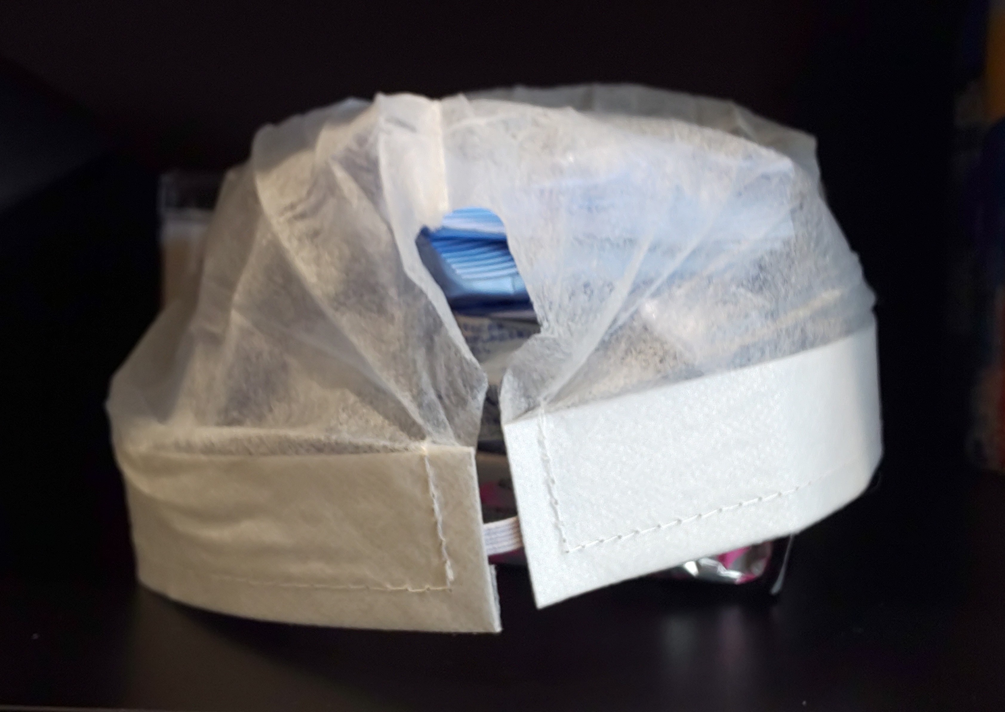 給食当番みたいな、水泳のキャップみたいな、不織布でできたもので、後ろにはゴムもついているので多少のサイズ調整が可能です。