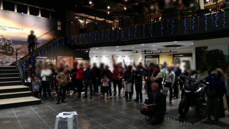 新型スクランブラー、ストリートツインのお披露目も併せて行う、今回のパーティー、実はこの写真の段階では陽の光が強すぎて、布が透けて中身が見えておりました( *´艸`)