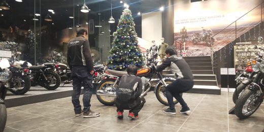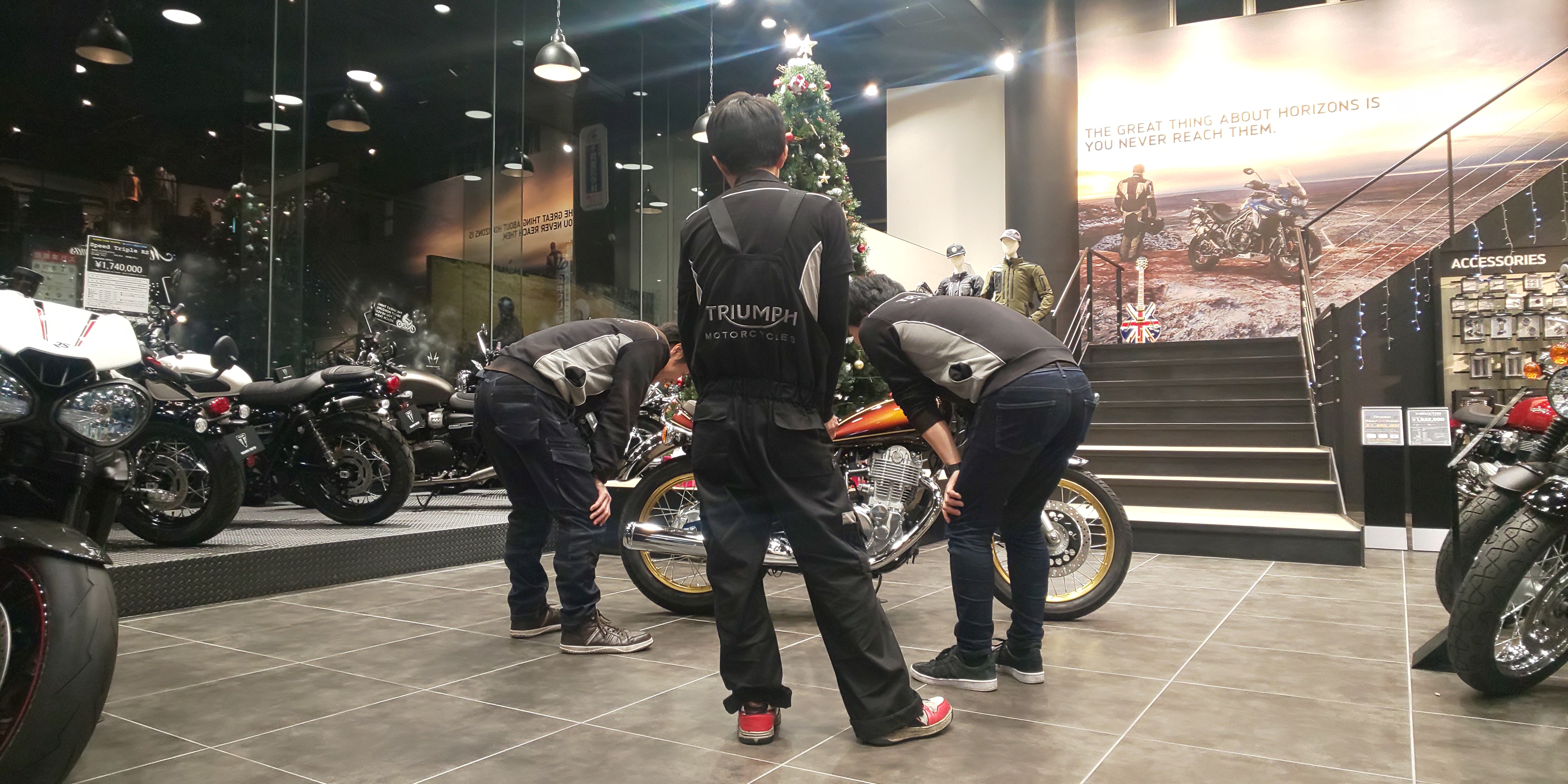 YAMAHAに興味津々すぎるTRIUMPHスタッフたち(笑)