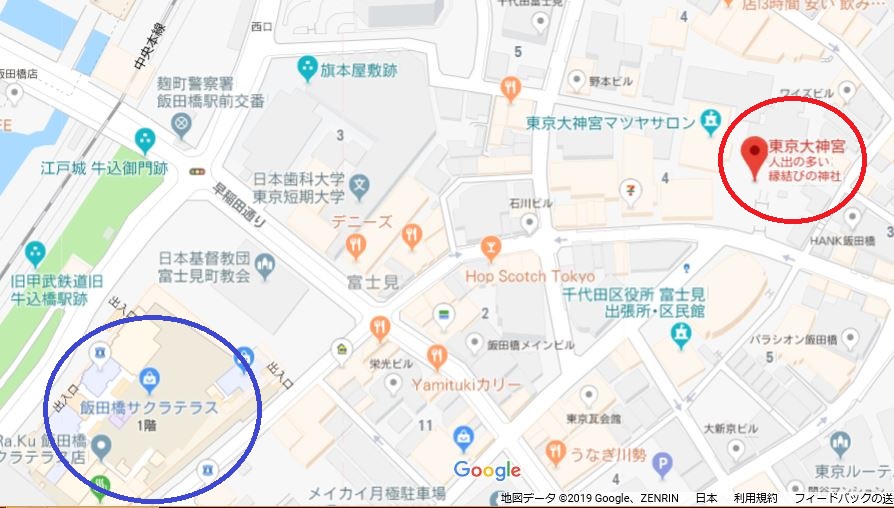 赤丸が東京大神宮ですが、最初に並んだのは青丸の所という…。