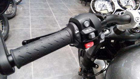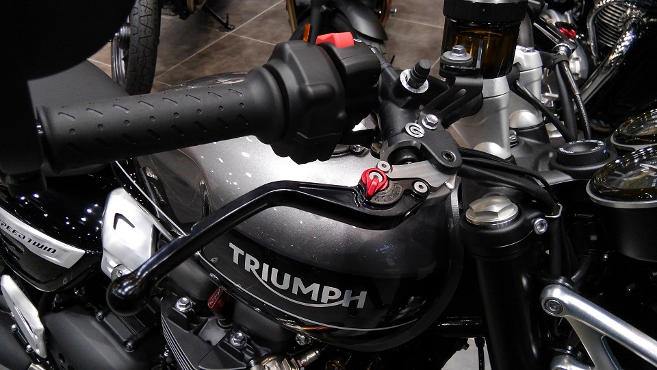 Speed Twinの試乗車には冬場の試乗を快適にしてくれるグリップヒーターと、CNCブレーキ・クラッチレバー、アルミニウム製サンププレートを装備!