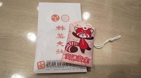 男性はちょっと困るかもしれない、武蔵境自動車教習所のキャラクター、ピックのイラストがついたお守り。