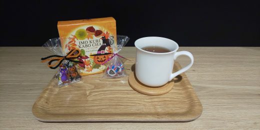 「秋の実りの人気者・栗とさつまいもの、ほっこり甘くやさしい香りのルイボスティーに、黄色いカボチャをトッピング。肌寒い季節に思わずほっとする風味です。」