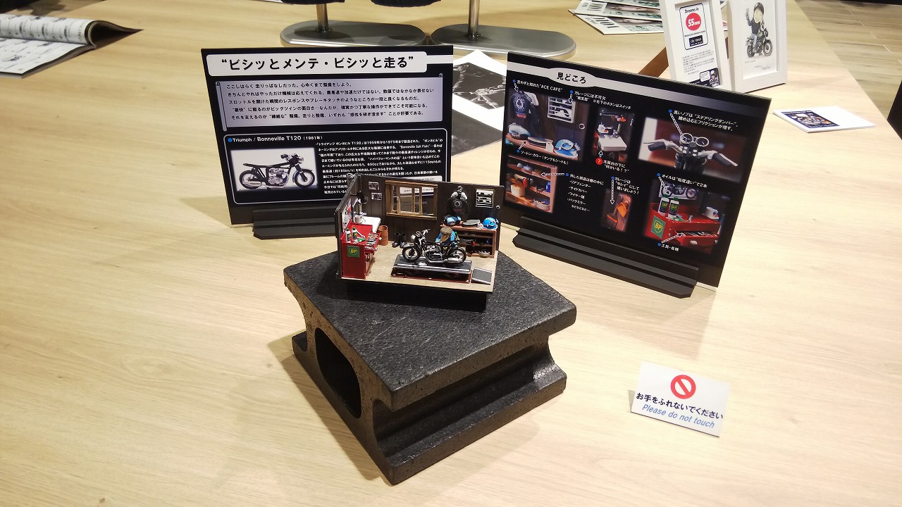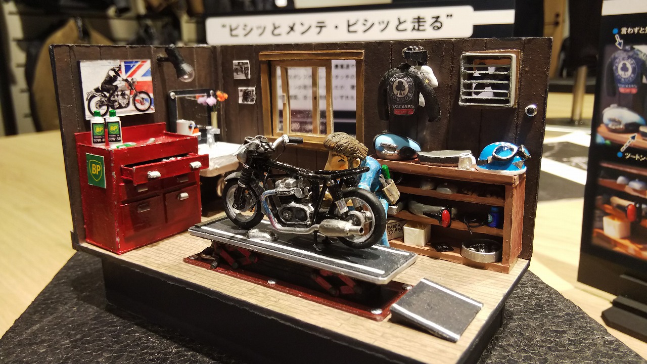きのう作品の入替を行い、今日から「ガレージでトライアンフのメンテナンスを行っている」様子を表現したミニチュアを展示しています。