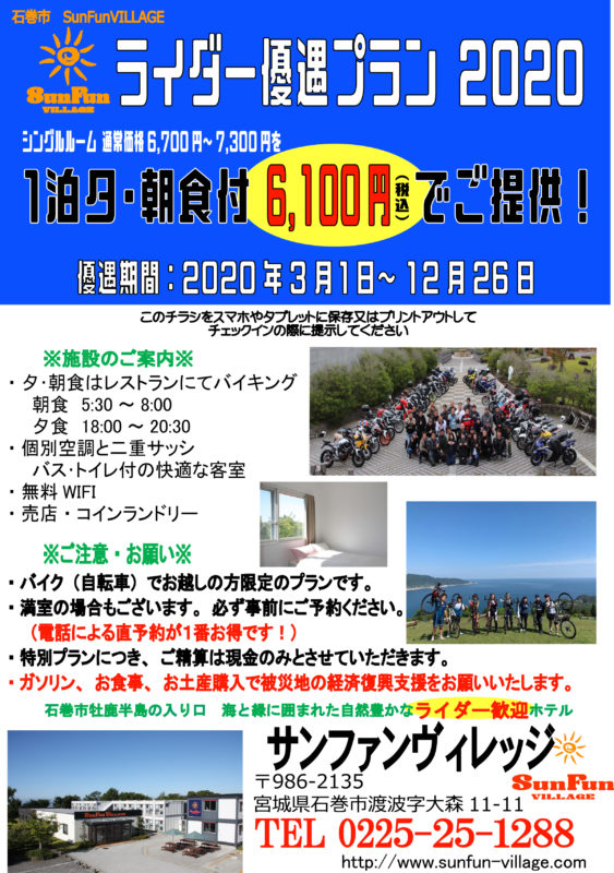投稿者は宮城県石巻市にあるホテル「サンファンヴィレッジ」さん、内容は「ライダー優遇プラン」の紹介でした。