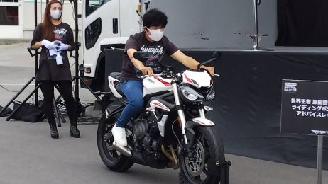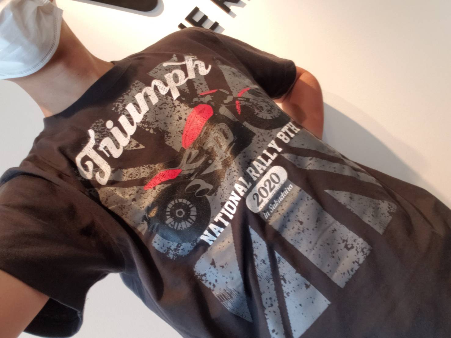 本題は、といいますと、上の写真で原田さんも着られている「TNR 2020記念Tシャツ」、本来会場のみでの販売ですが、ただ今トライアンフ東京にMサイズが2枚!在庫ございます!!!