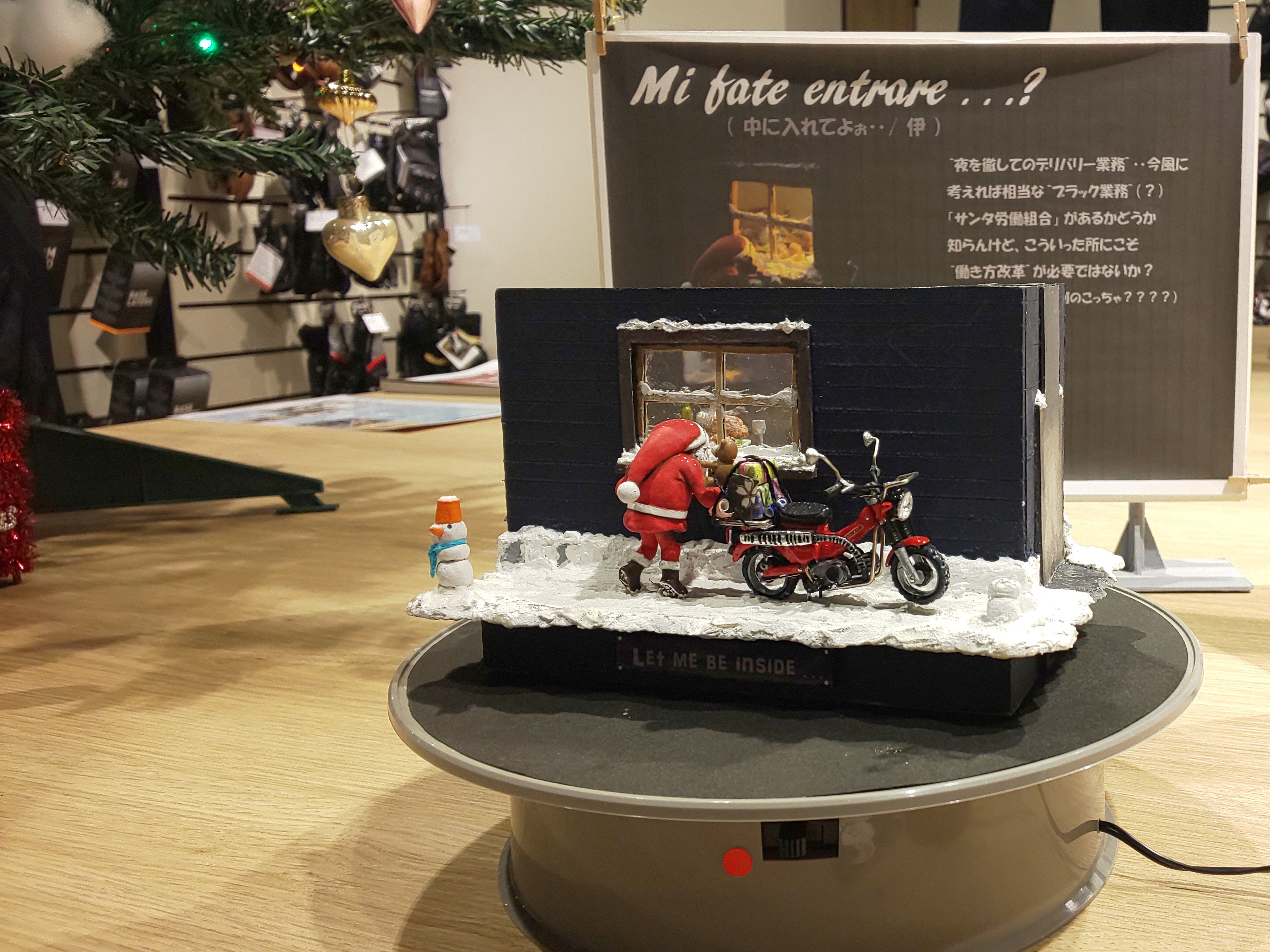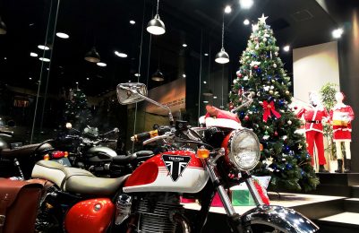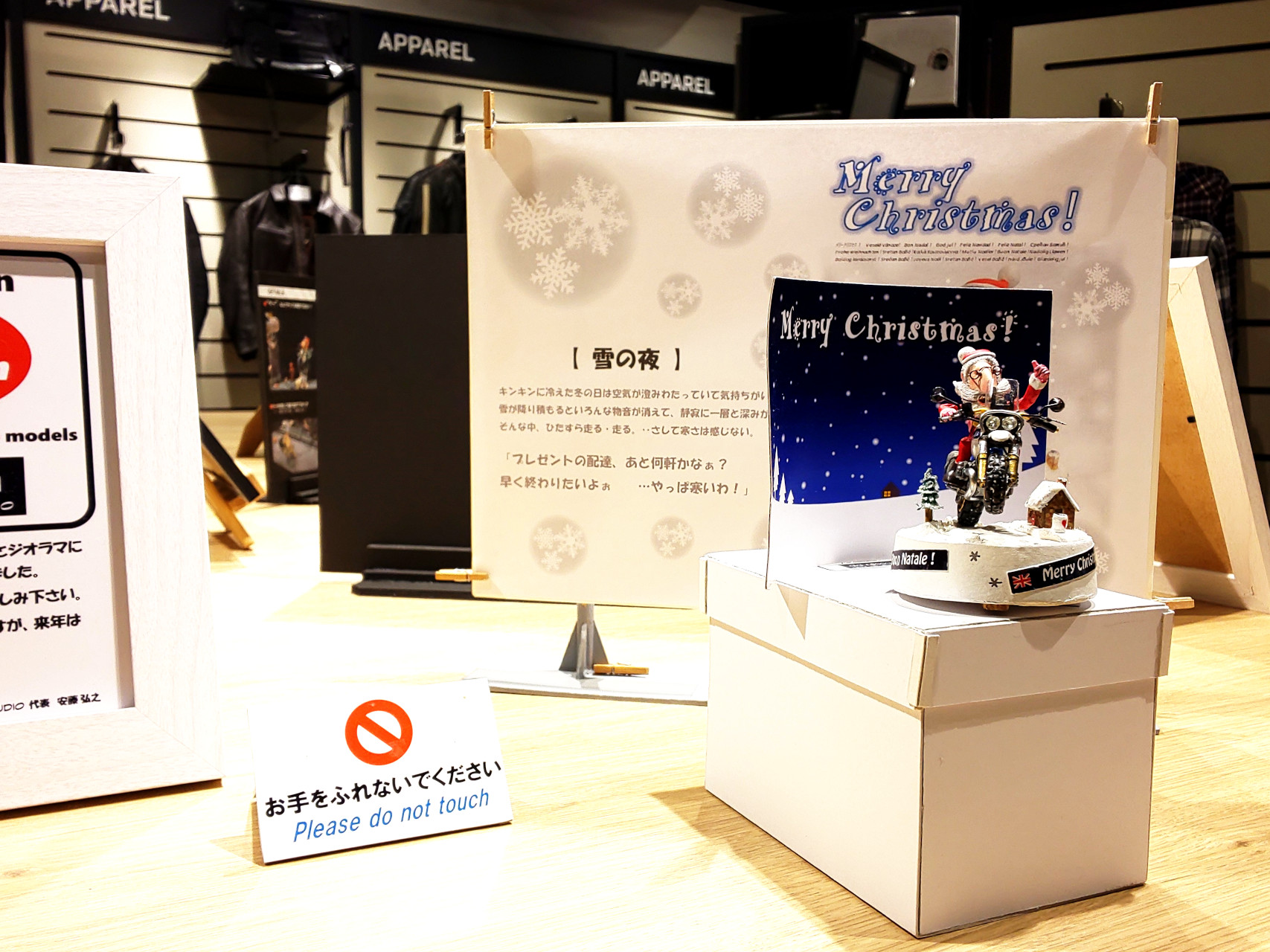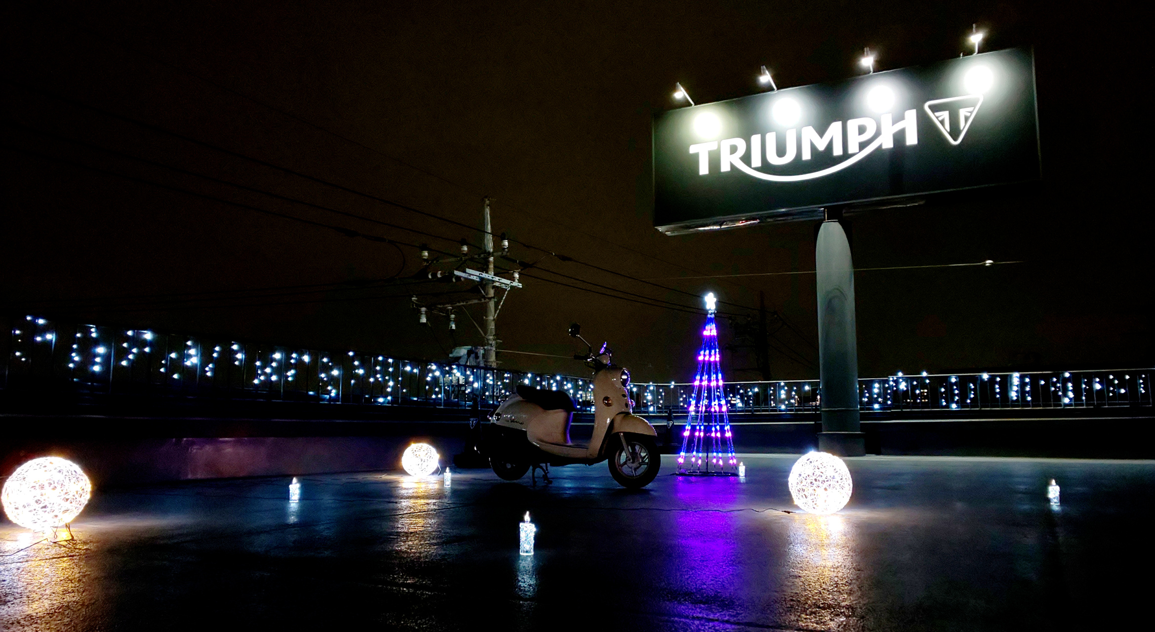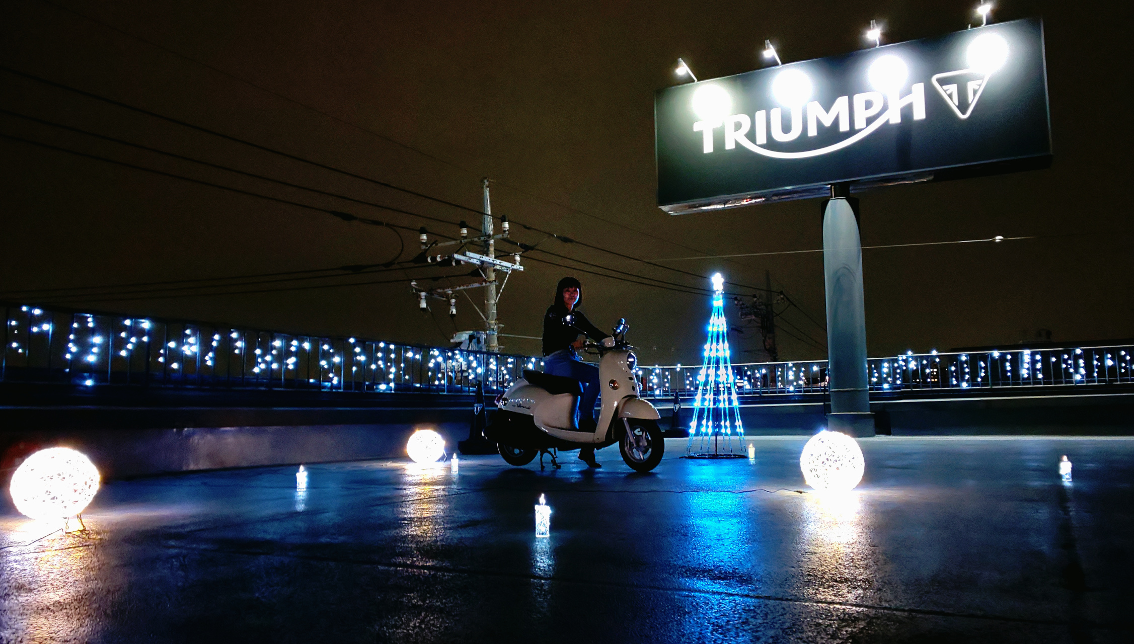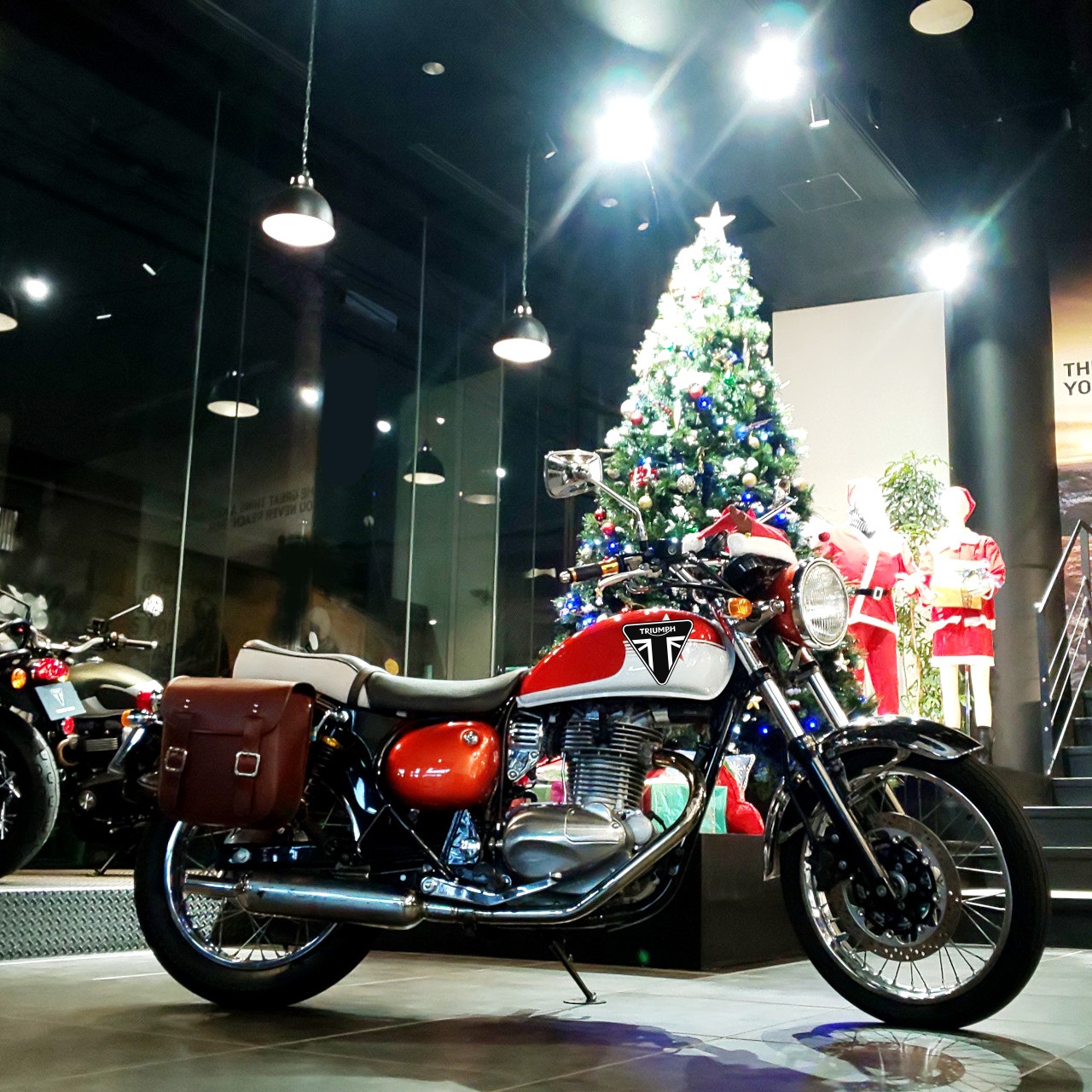 「トライアンフ東京店内の大きいツリーの前で、愛車の写真(もちろん愛車と一緒に、も)を撮りましょう!」