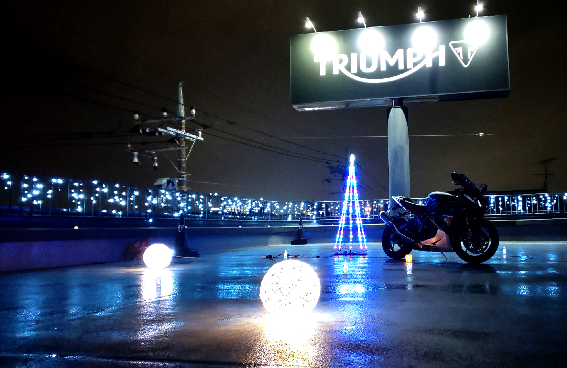 夜空を眺めるもよし、TRIUMPHサインボードを背景に愛車を撮影するもよし。