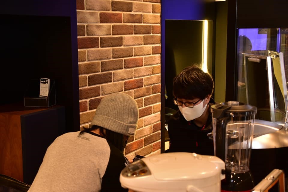 まず、第一に「密を避けるには…」という所から、寒いですが屋上を開放しての夜カフェ形式に。