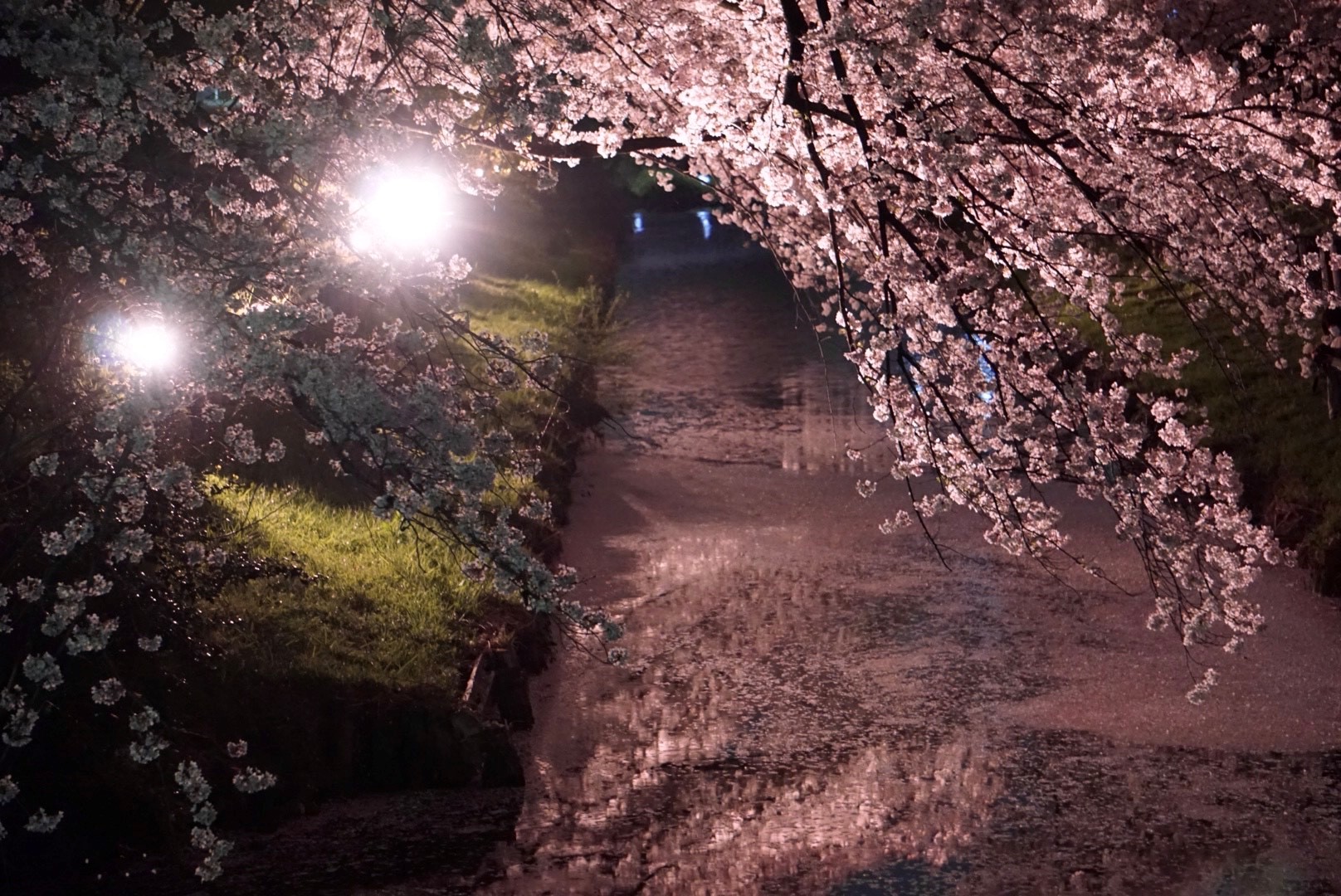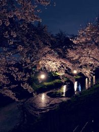 しばらく川沿いを走らせていると、一部明るい桜並木が見えてきた。