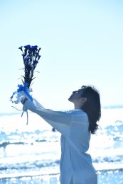 8本の青いカーネーションを空に掲げる華さんのシルエットが!