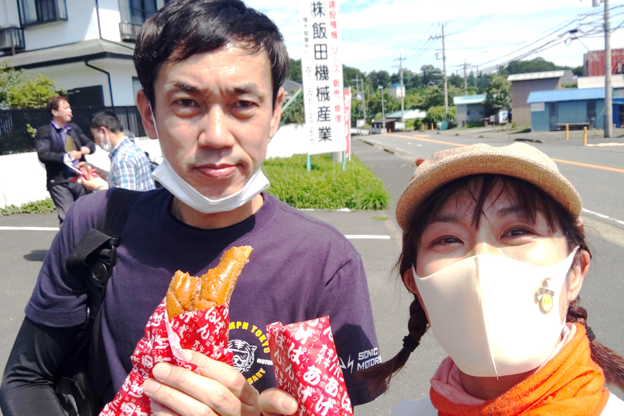 あげぱん配りのOKBと笑顔で受け取るかるかん氏。