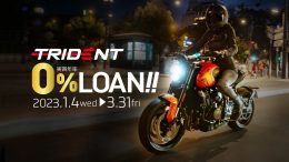 内容:キャンペーン期間中、全国のトライアンフ正規販売店にて対象車両をご成約、且つローン契約を完了していただいたお客様に、「0% ローン」をご提供いたします。