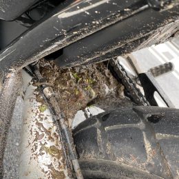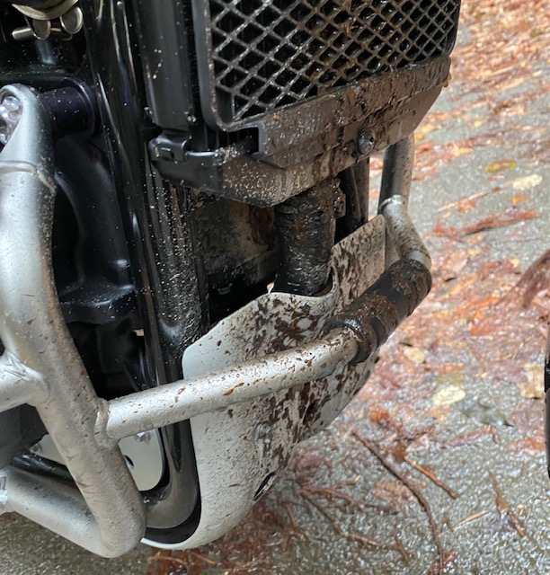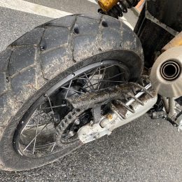 今回のツーリングは難ありルートを通ったせいもあって、どこもかしこも泥んこだらけ。さすがに、このままでは可哀そうなので洗車場によって洗うことに。シート後ろにまで泥が跳ねてるってことはジャケットの後ろ姿は・・・・ご想像通り・・・。(※写真撮り忘れましたが、もちろん、帰ってすぐに洗いましたよ。)