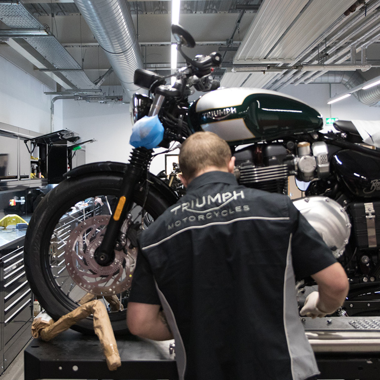 このようにトライアンフでは、故障による修理、点検整備、ツーリング先でのトラブルなどの心配をすることなく、安心してバイクライフを楽しめるようになっています。