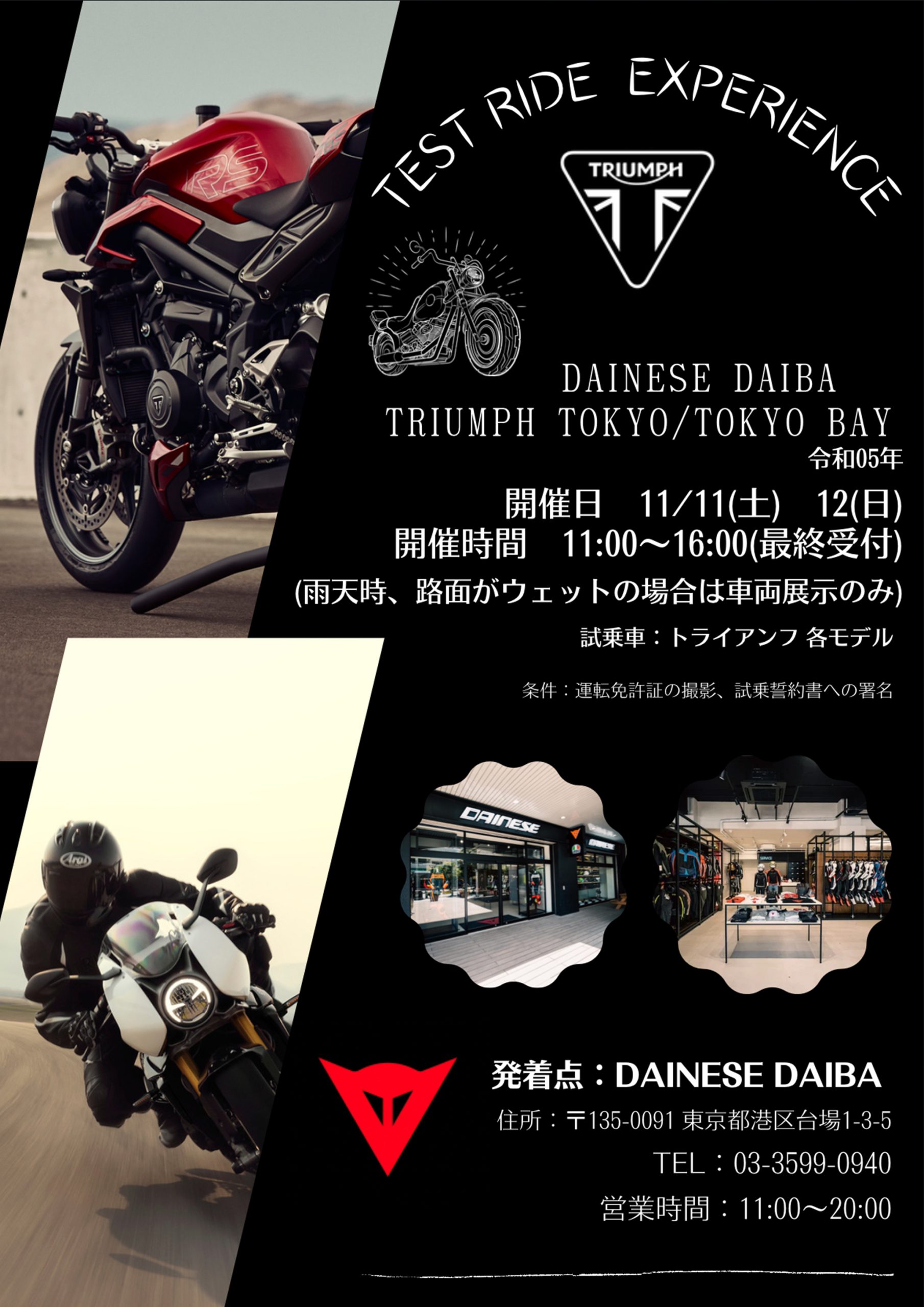 トライアンフ東京/東京ベイでは11/11(土)12(日)お台場にて試乗会を開催いたします。
