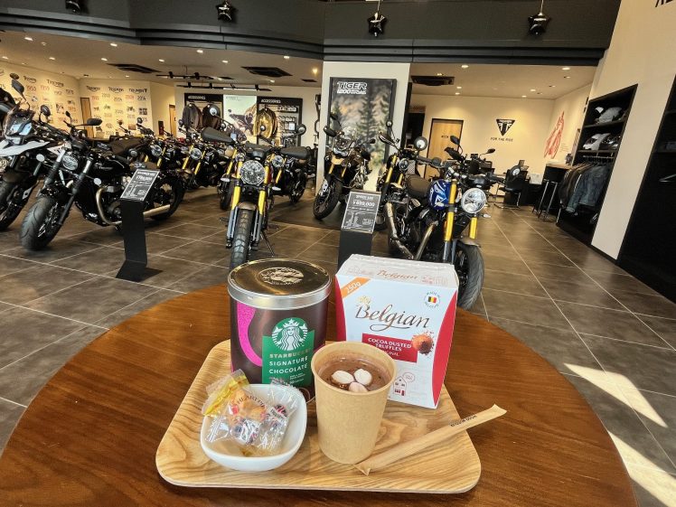 という訳で、トライアンフ東京では、只今、オリジナルホットチョコレートドリンクをご提供中です。(*^-^*)