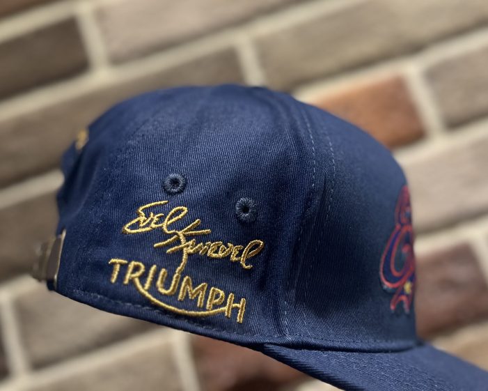 T-SHIRT、CAPともに「EVEL」タイポグラフィにゴールドの王冠グラフィックと