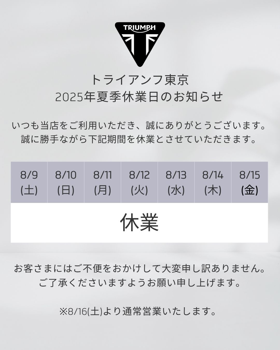 誠に勝手ながら、トライアンフ東京・東京ベイ・松本では8月9日(土)~15(金)までの間、夏期休業とさせていただきます。
