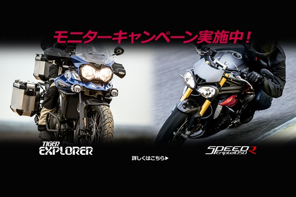 トライアンフ モーターサイクルズ ジャパンは、トリプルフェアー連動企画として、7月25日より「Speed Triple R」,「Tiger Explorer XRX」のモニターキャンペーンを実施いたします。専用応募ページからエントリーされた方の中から抽選で各車両1名様に1ケ月間モニターとして無料でお乗りいただきます。また、応募された方の中から抽選で10名様に「トライアンフ・マルチツール」をプレゼントいたします。この機会をお見逃しなく! ご応募をお待ちしております。