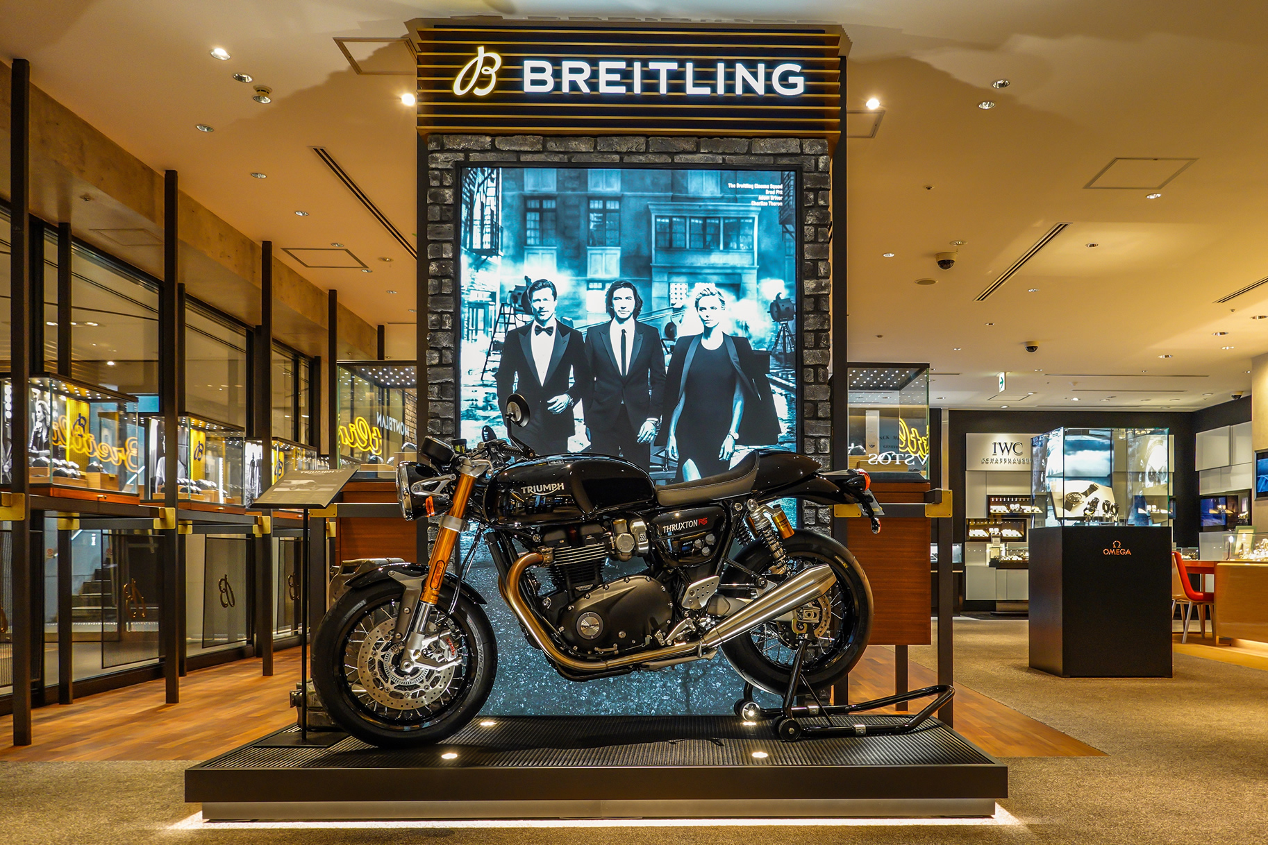 両社の旅はすでに始まっています。現在、オリジナルのモダンカフェレーサーであるTriumph Thruxton RSが、世界各国の主要ブライトリング ブティック等に展示されています。 日本ではスピリット・オブ・ブライトリング表参道 BY ISHIDA にThruxton RSを展示しています。