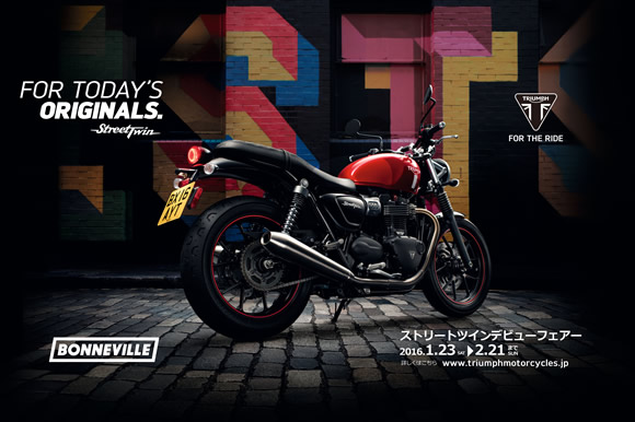 トライアンフ モーターサイクルズ ジャパンは、1月23日(土)より全国のトライアンフ正規販売店にて、『STREET TWIN DEBUT FAIR(新型ストリートツインデビューフェアー)』を実施いたします。
