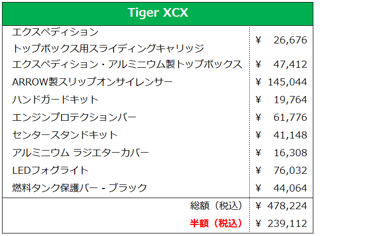キャンペーン適用例 2:TIGER 800 XCX アクセサリー半額
