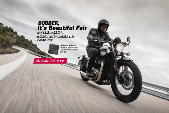 トライアンフ モーターサイクルズ ジャパンは、2017年1月のデビュー以来、その高いデザイン性と美しいスタイリングで圧倒的な人気を誇るボンネビルボバーの2017年度グッドデザイン賞受賞を記念して、11月3日より「Bobber, It’s Beautiful Fair」を開催いたします。