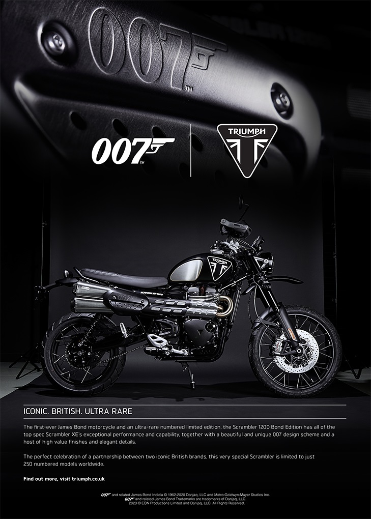 2019年12月、トライアンフは「007」シリーズの製作会社であるイーオン・プロダクションズと新たにパートナーシップ契約を締結したことを発表し、シリーズ最新作となる第25作『007/ノー・タイム・トゥ・ダイ』のダイナミックなアクションシーンでトライアンフのバイクが使用されていることを明らかにしました。