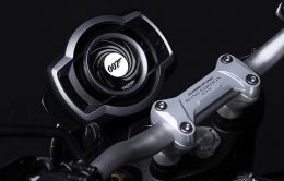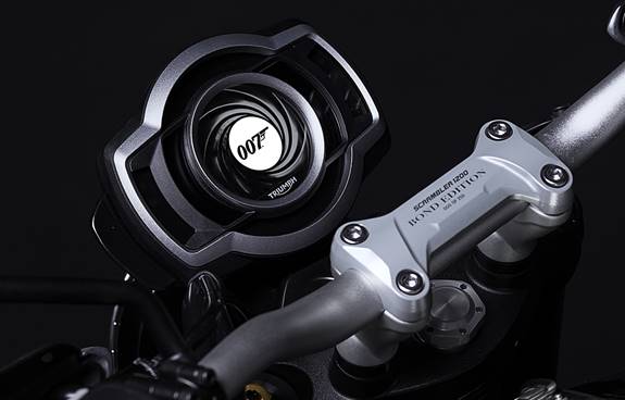 タンクには特大サイズのトライアンフバッジとブラッシュ仕上げのデカールフォイルニーパッド、そしてゴールドの手描きコーチラインが入ります。「007」モデルであることを示すロゴも随所に取り入れられます。美しいエキゾーストナンバーボードとサイドパネルロアフィニッシャーには「007」のロゴがプレス加工され、高級本革シートにはロゴ刺繍が施され、TFTディスプレイには「007」専用のスタートアップ画面が採用されます。